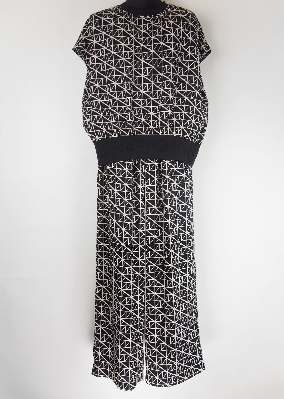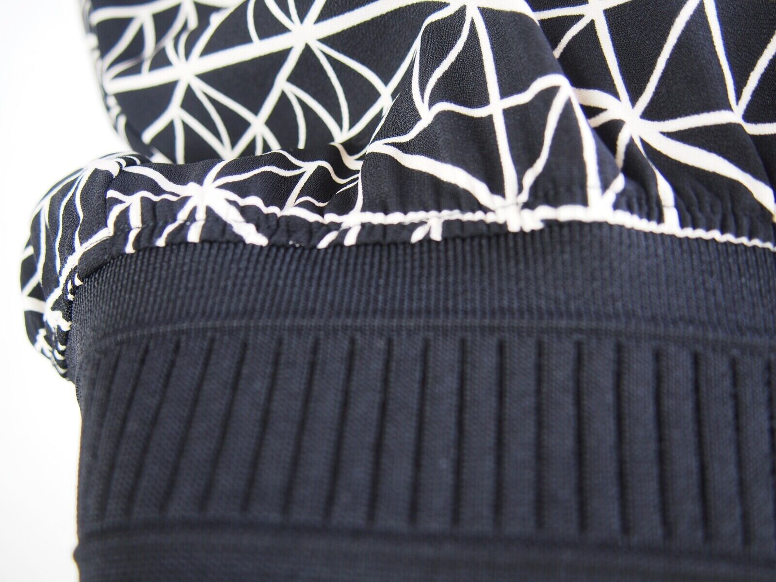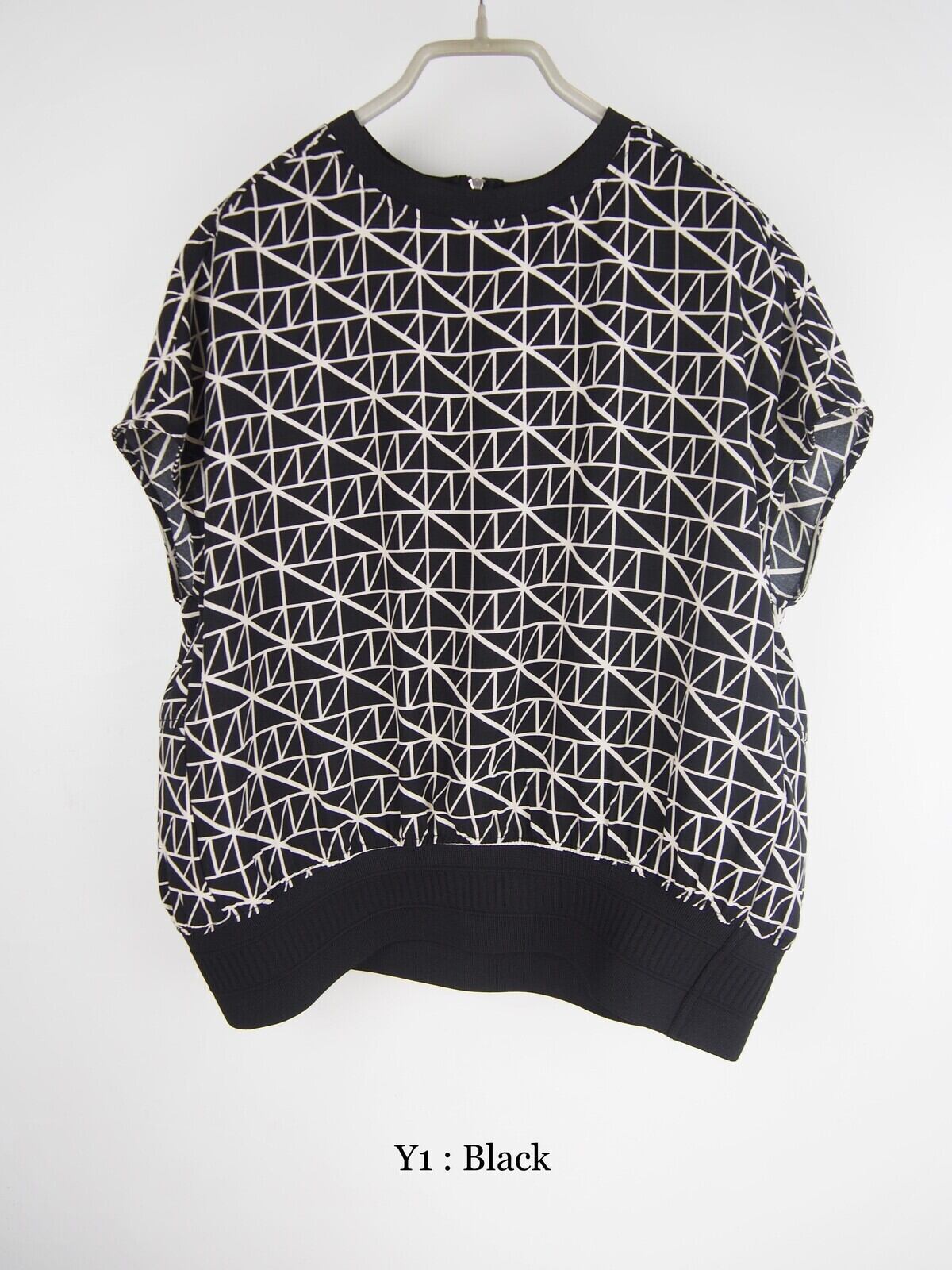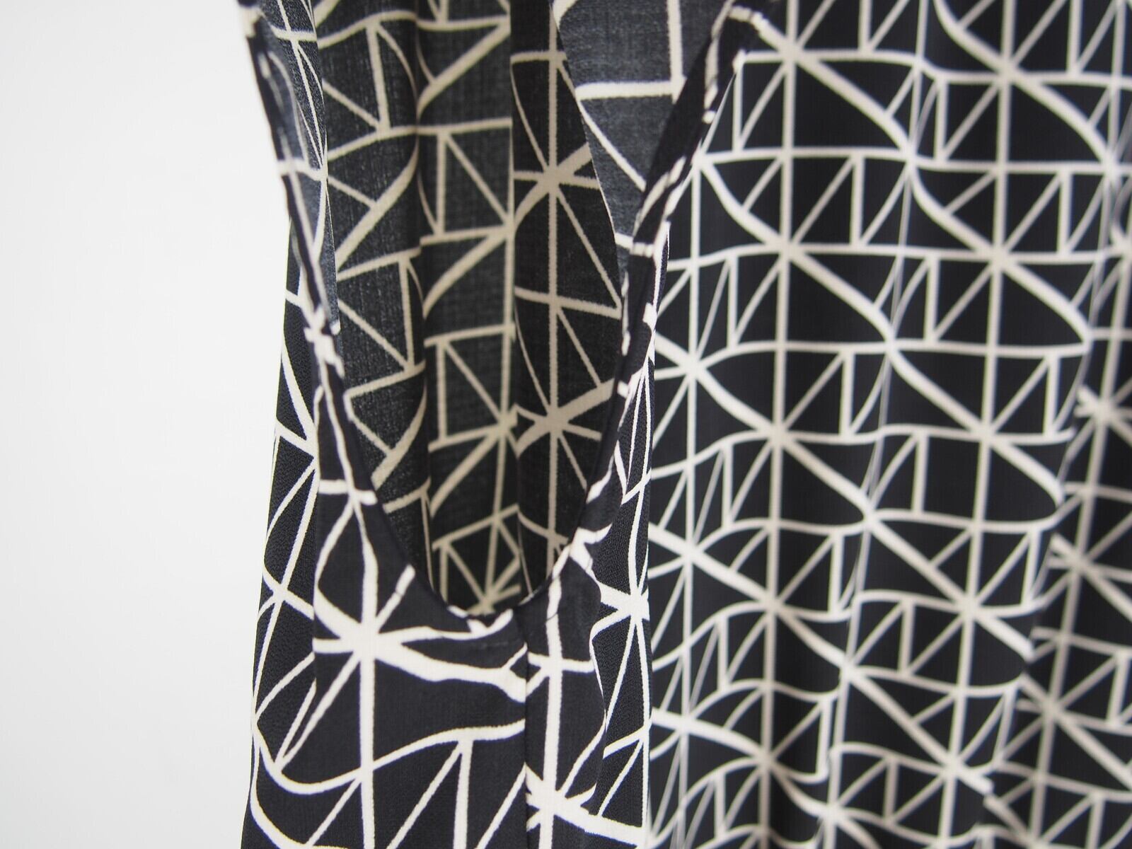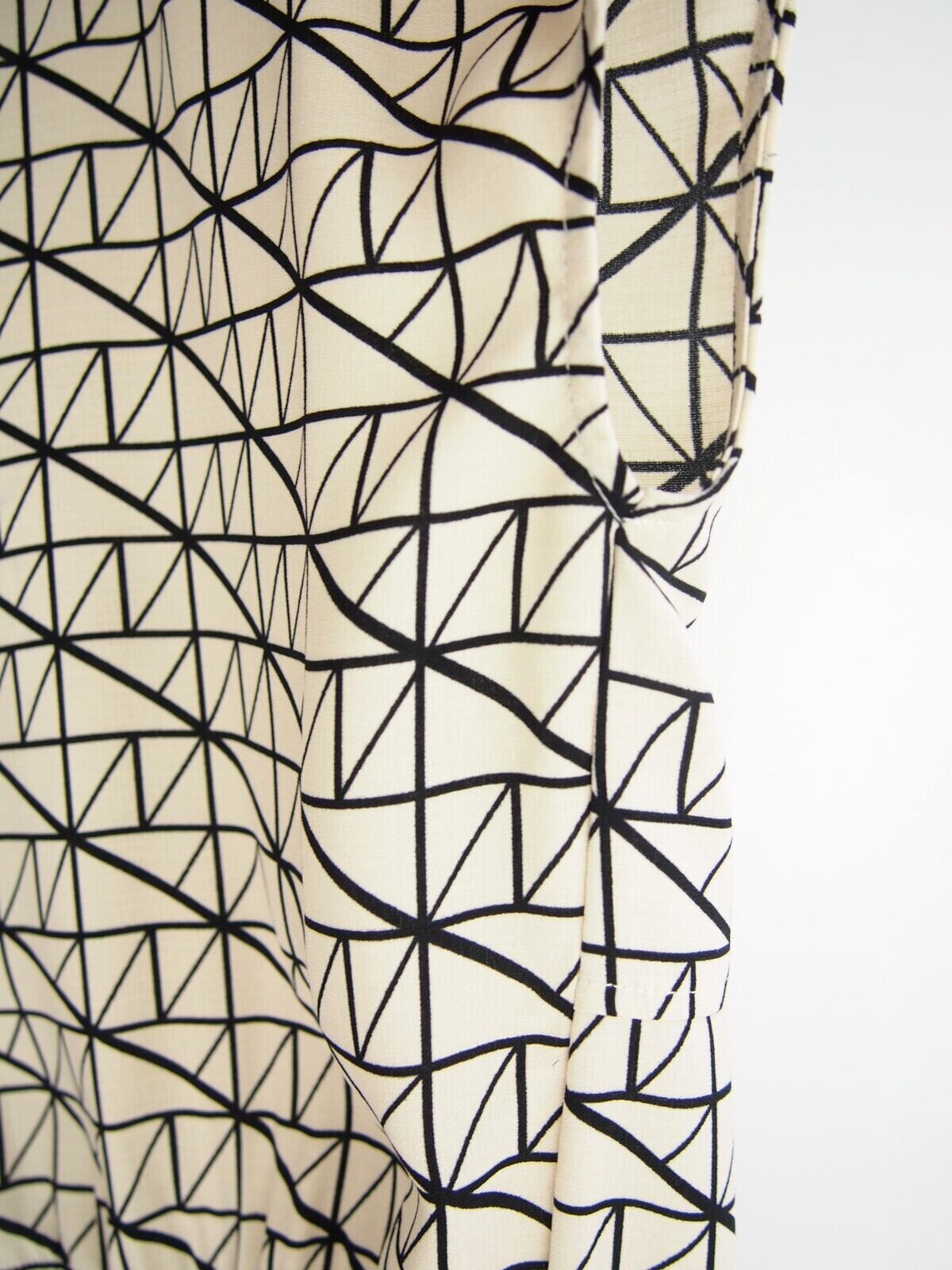 肌離れの良い梨地タッチのドライポリエステルを使用し、滑らかで上品なドレープを作るジオメトリックプリントシリーズ。