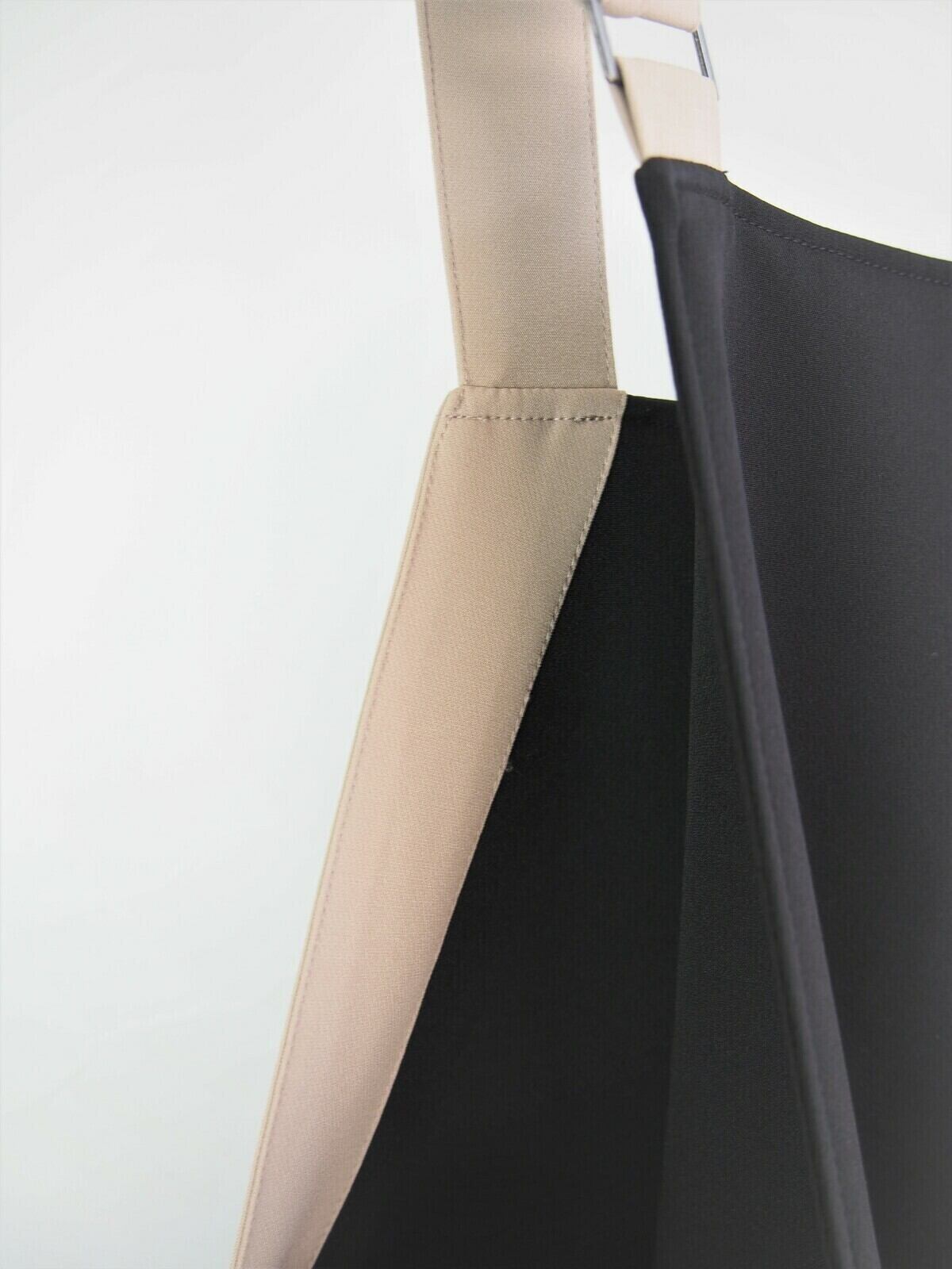 全体のスッキリとしたラインを作るバイカラー(配色3cm)ベルト幅と切り替え部分からの豊かなフレアーシルエットがバランス良くマッチするジャンパースカート。