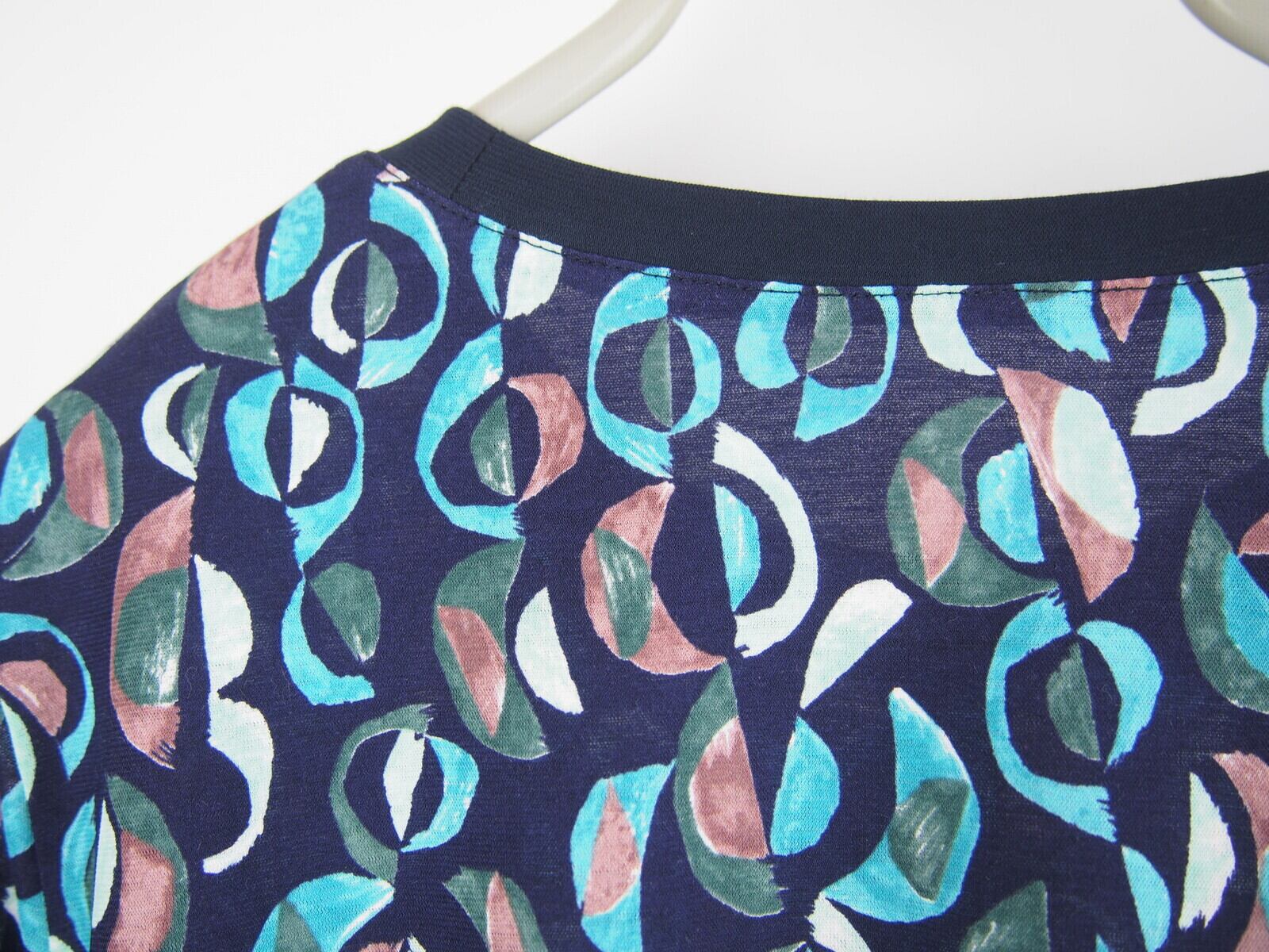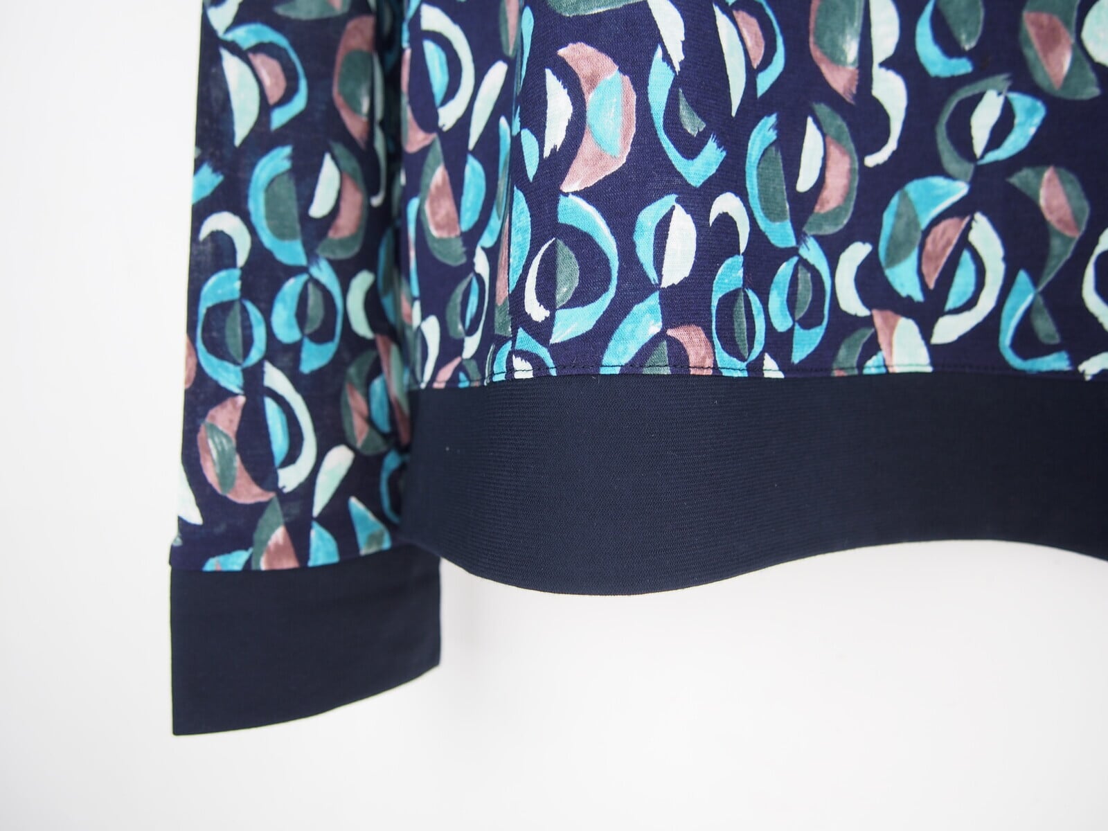 襟・袖・裾部分は同素材の無地パーツで縁取り、すっきりとした印象の切替デザインです。