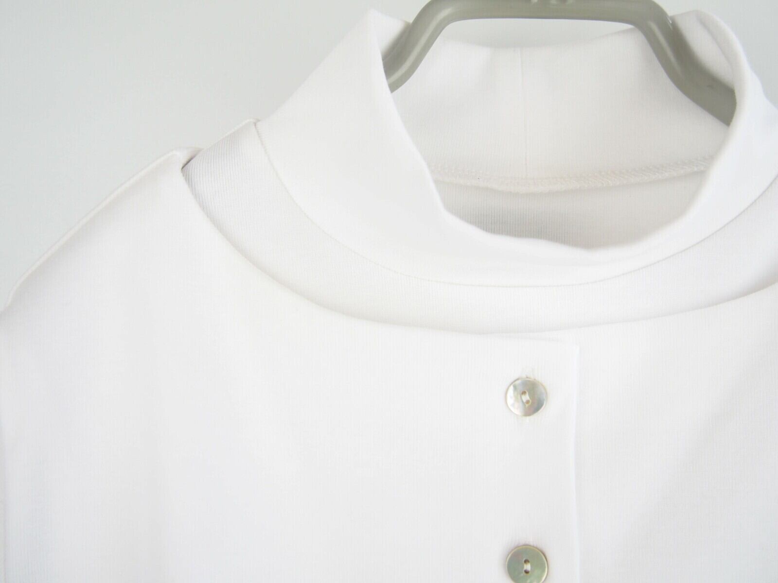 首元を優しく包むダブル仕様のハイネックの綺麗な立ち上がり、フラットなヘムラインを作る両サイドのスリットディティール、アームホール部分のバインダーは弾力を加えたフィット感が 気持ち良く作用する快適な着心地です。
