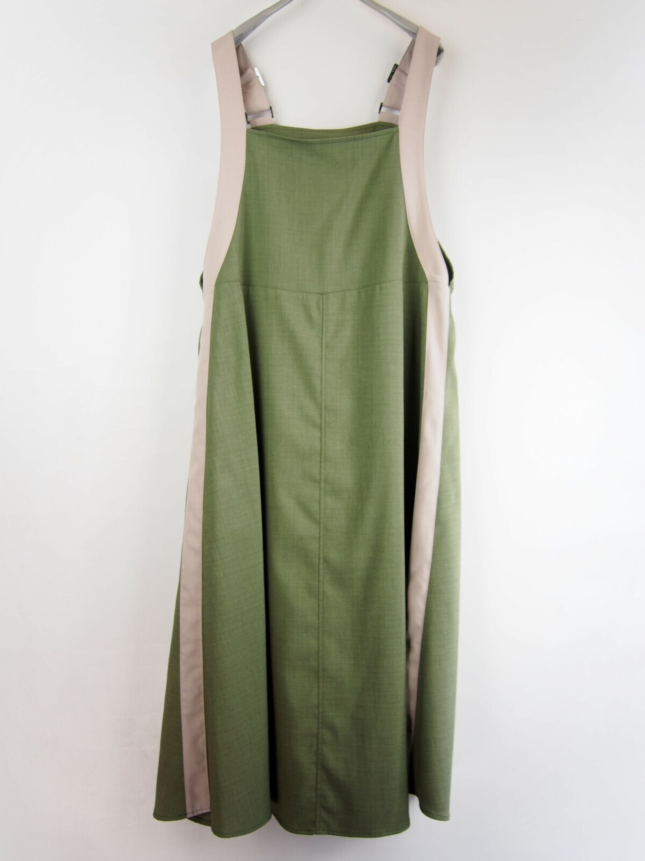全体のすっきりとしたラインを作るバイカラー(配色3cm)ベルト幅と切り替え部分からの豊かなフレアーシルエットがアクセントになったジャンパースカートです。