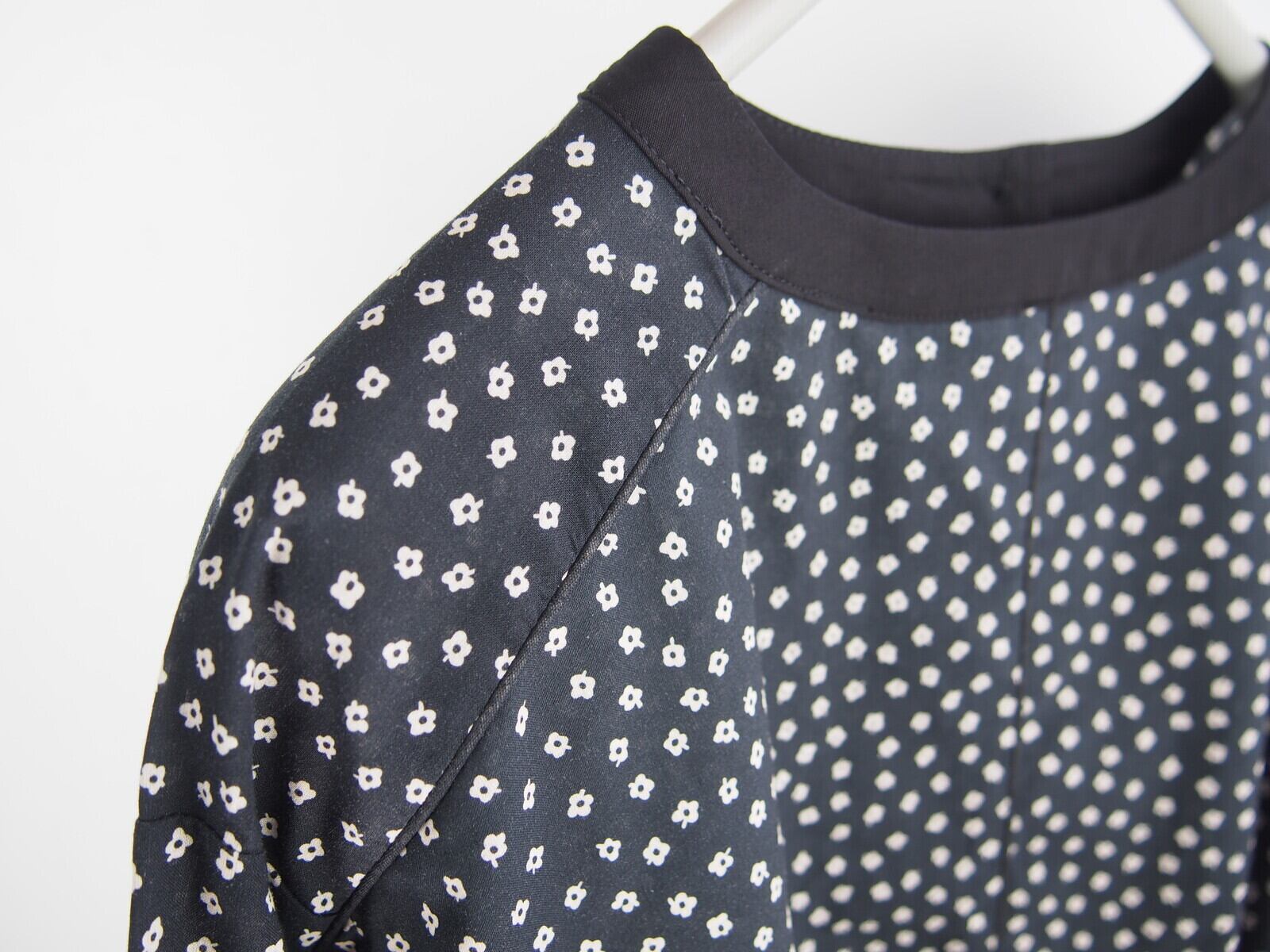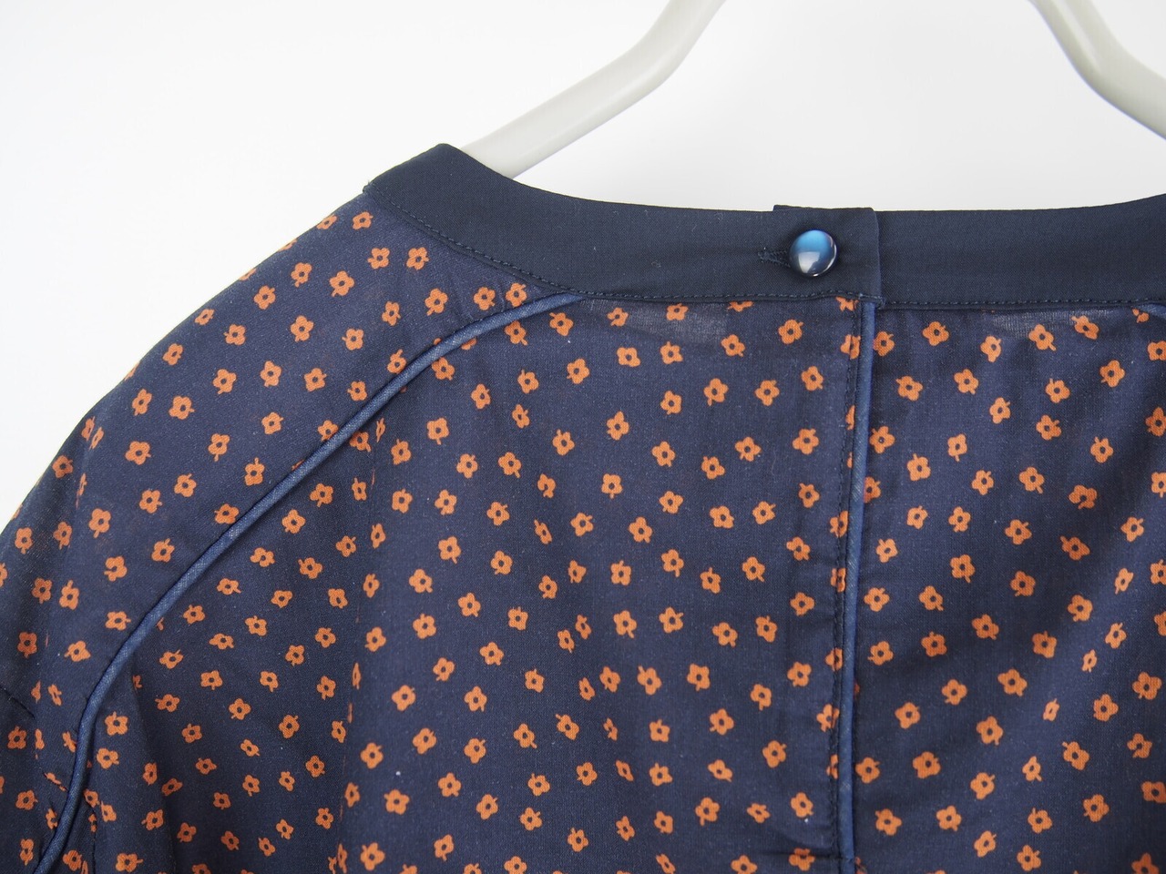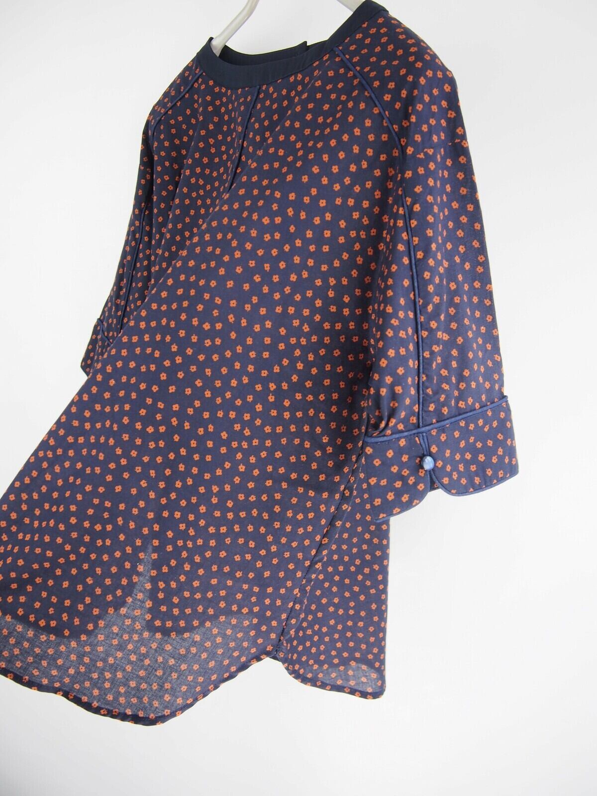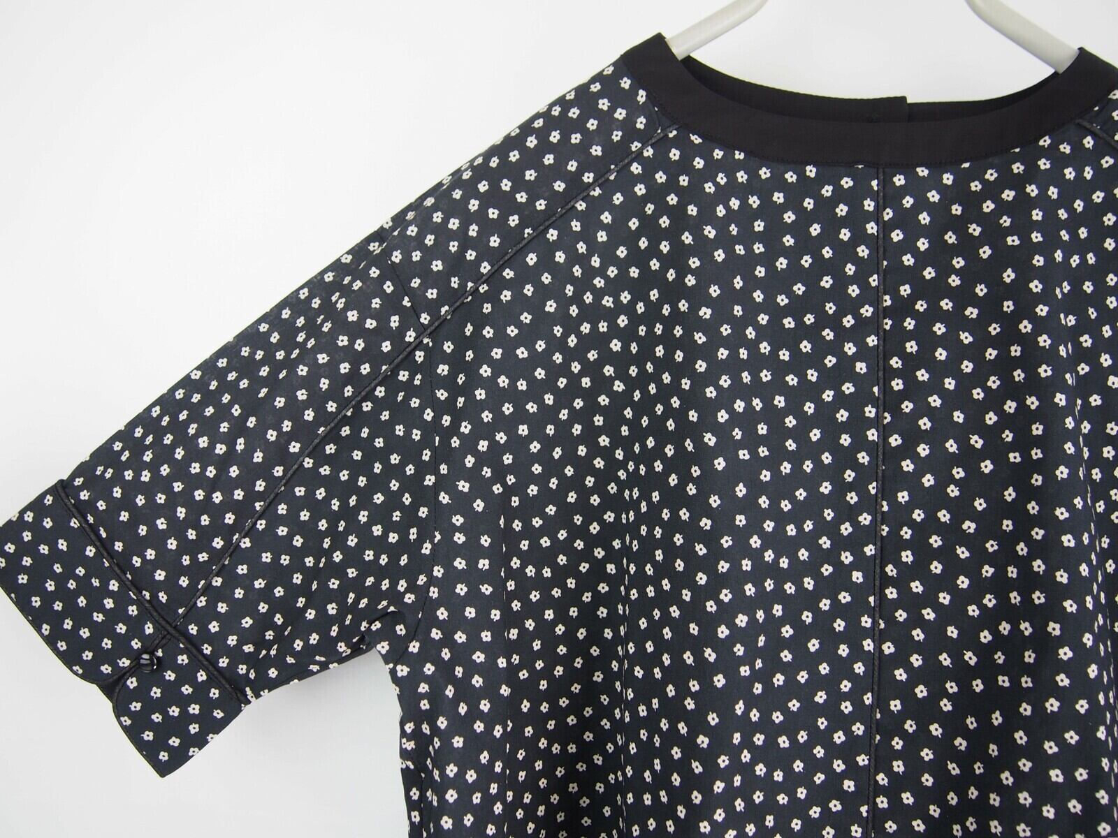 全体にゆとりのあるオフショルダーパターンにパイピング仕様のアクセント、同無地使用のボートネック調ネック、カーヴィな幅広5分袖丈の1釦スリーブデザインもポイントになったディティールです。