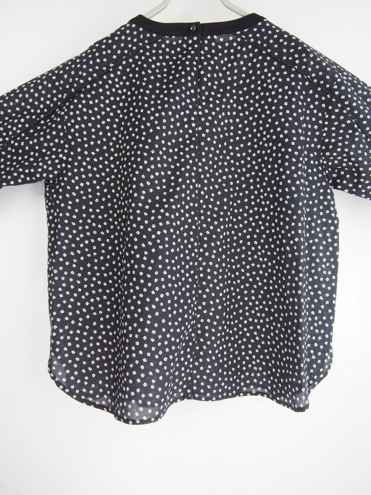 ドット柄のように細かなプチフラワープリントが載った綿ローン素材で、シアー感と清涼感、1枚でも充分なデザイン性を持つティーブラウスです。