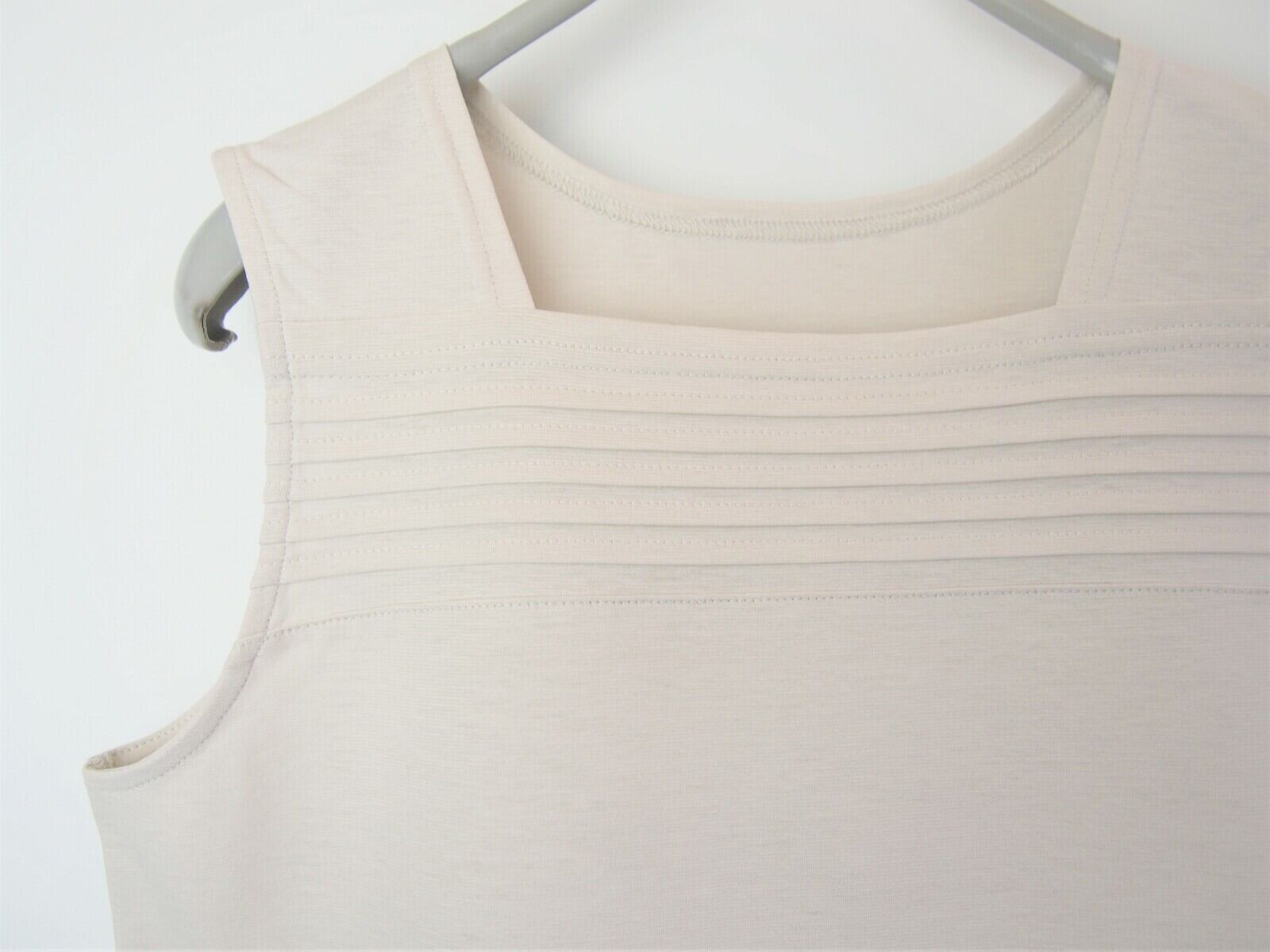 特筆すべきは、クラフトマンシップによる断層になった美しいピンタックボーダーと肩にかかる生地部分のカーブ曲線、着用時にスルりと肩にアジャストするパターン角度。