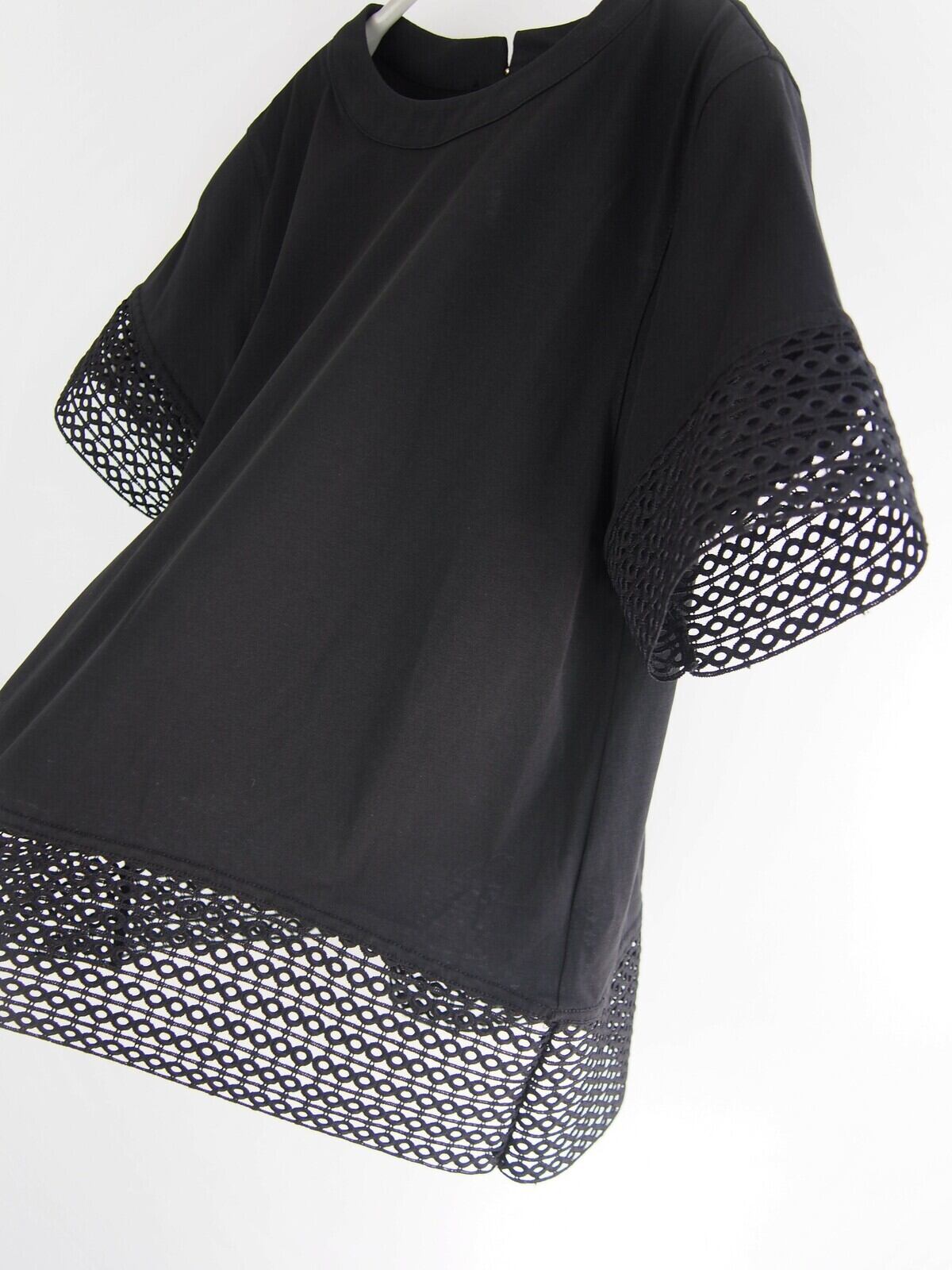 コットンポリエステルの細番手によるドライタッチサラサラ天竺ボディに均等なプチサークルパターンのチェーンレースをぐるりプラスした異素材コンビ。