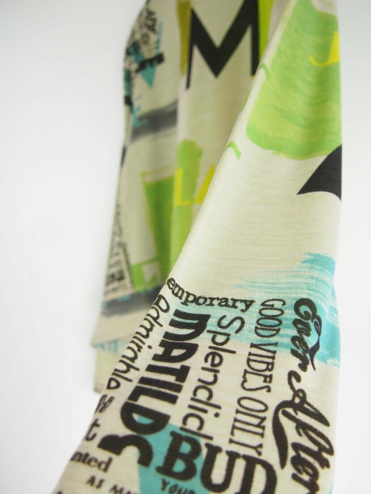 大小さまざまなアルファベットがアートをバックに写るプリント(裁断の関係上、配置は1点ずつ異なります)。両サイドに入るエクステンションの切替がドレープを利かせたテントラインを作ります。