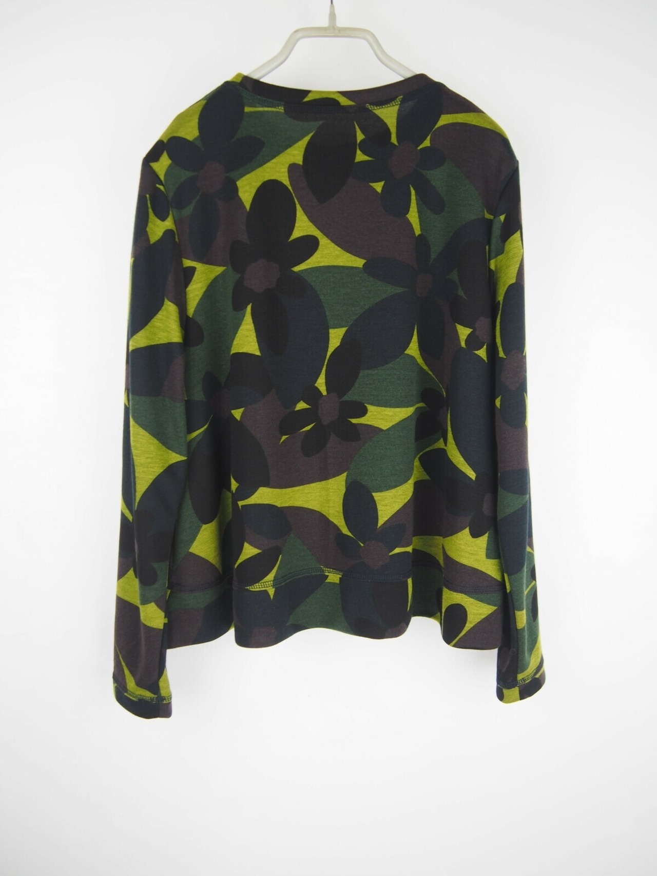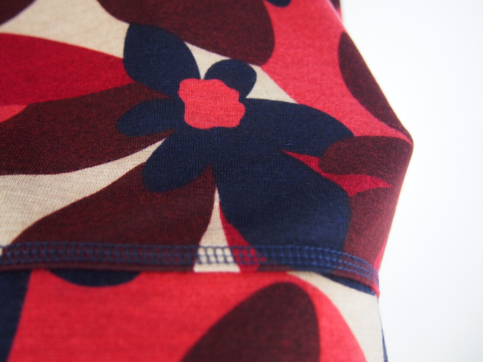 ランダムに重なり合うマルチカラーのビッグリーフフラワープリント(裁断の関係上、配置は1点ずつ異なります)。両サイドに入るエクステンションの切替がドレープを利かせたテントラインを作ります。