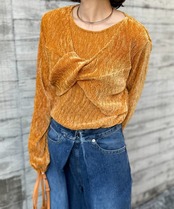乱反射するシャイニーなベロアのプリーツ生地で、トレンドのビスチェをレイヤードしているようなデザイントップスです。
